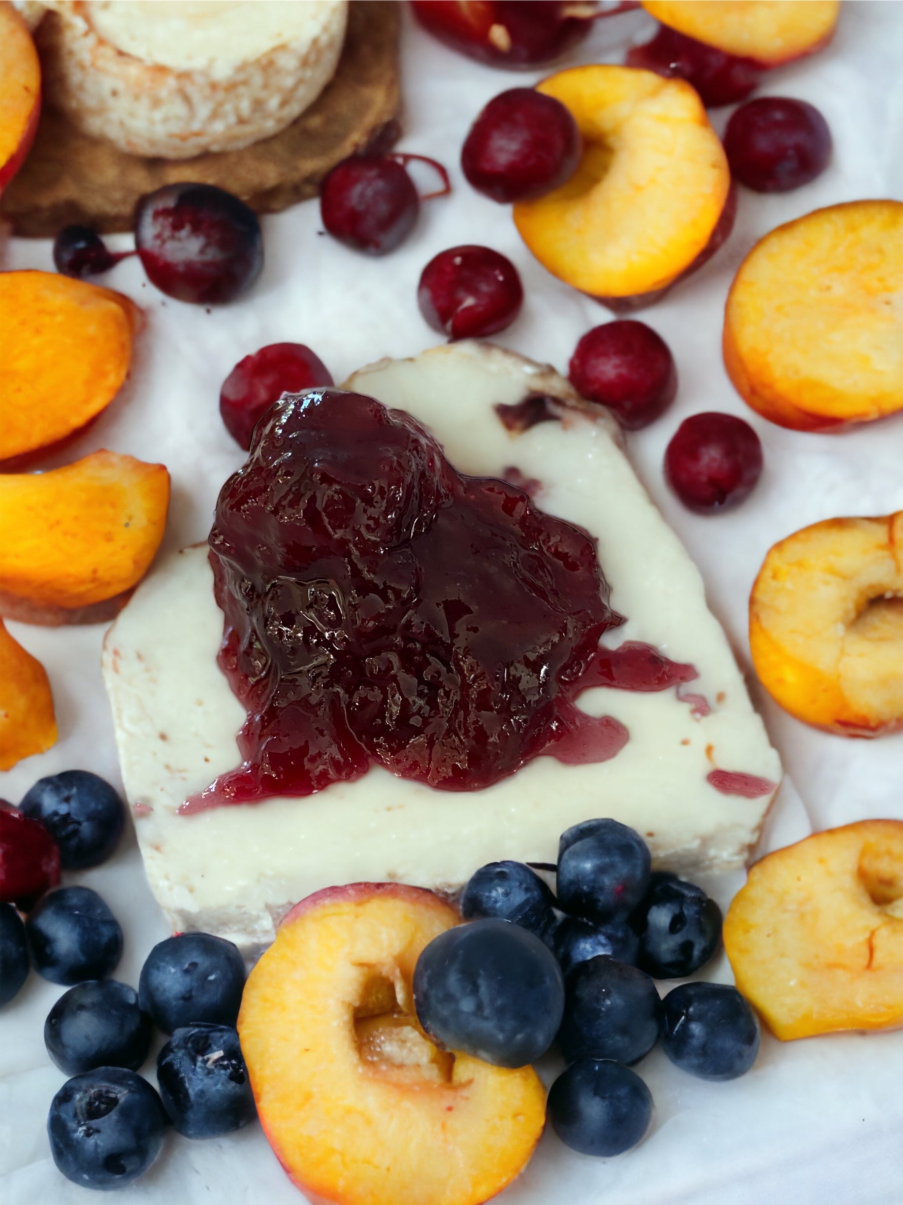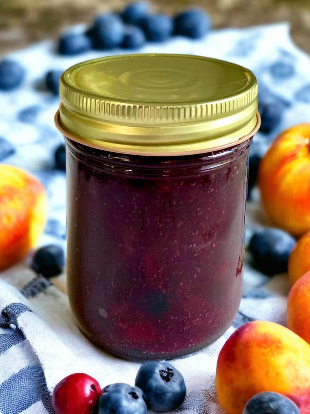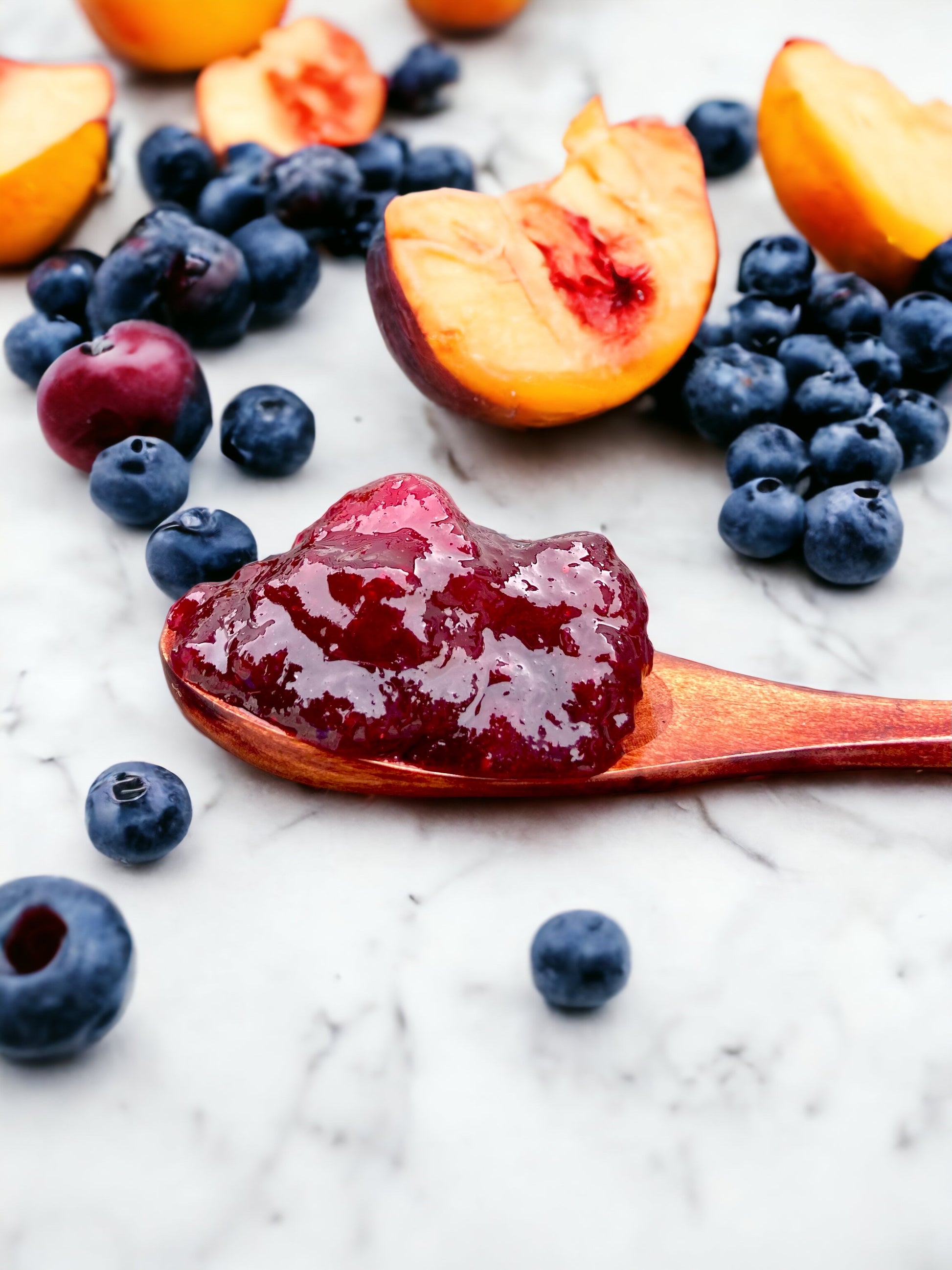 I came up with this flavor based off a pie I had from a local farm from my hometown. It's a blend of peaches, cherries, and blueberries. I loved the pie so much that we started to add it to our Thanksgiving pie line up. So it goes without saying that I had to make a jam with that same combination, minus any spices because the fruit can stand on Its own. This jam goes well with just about anything you pair it with. My favorite way to eat it is on a hot English muffin!